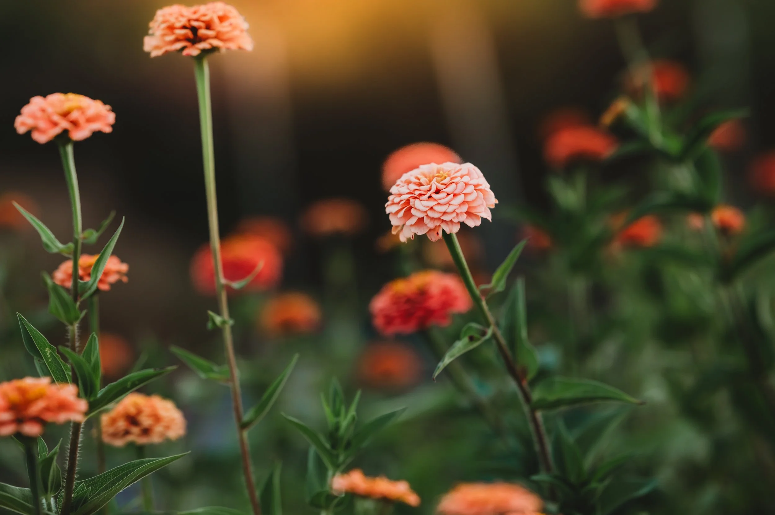 Close-up of pink and peach flowers with green stems and leaves in a garden at sunset.
