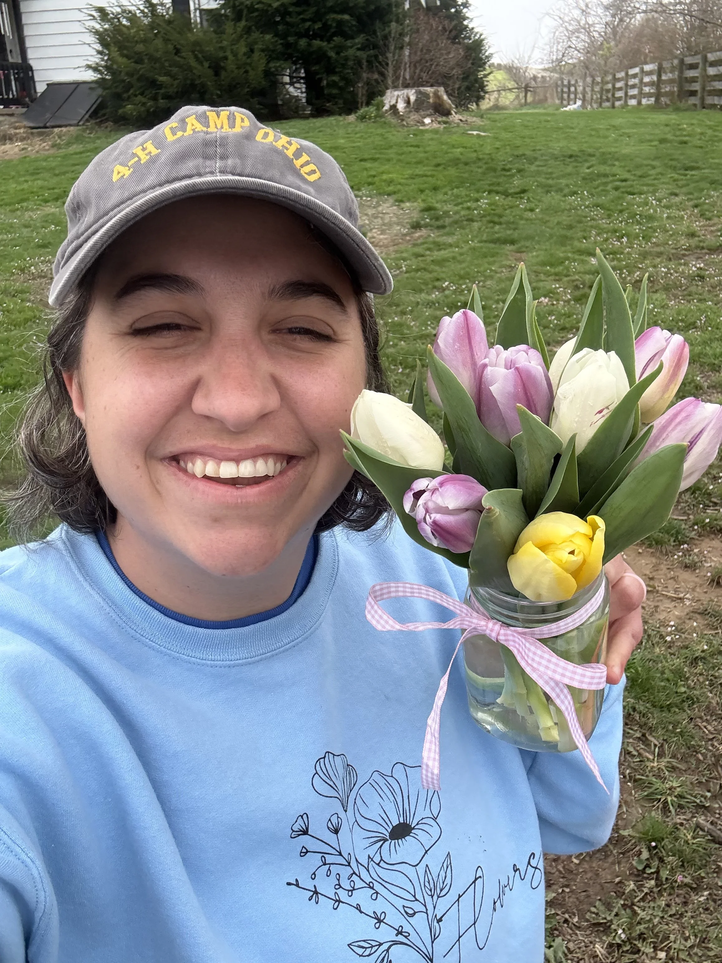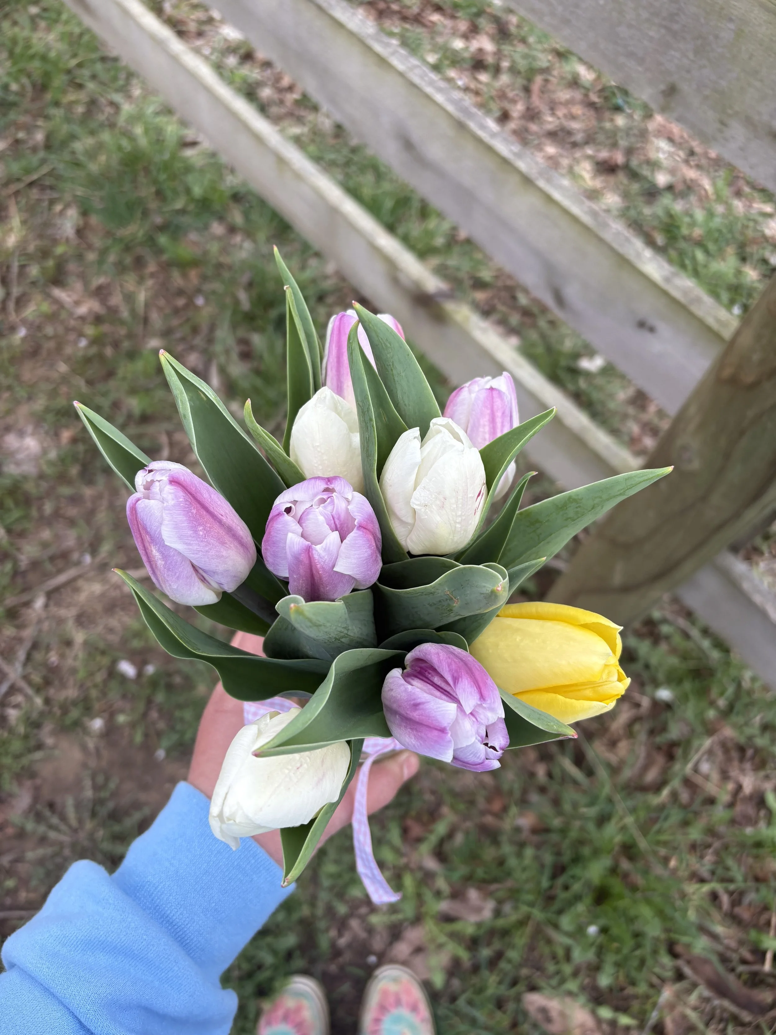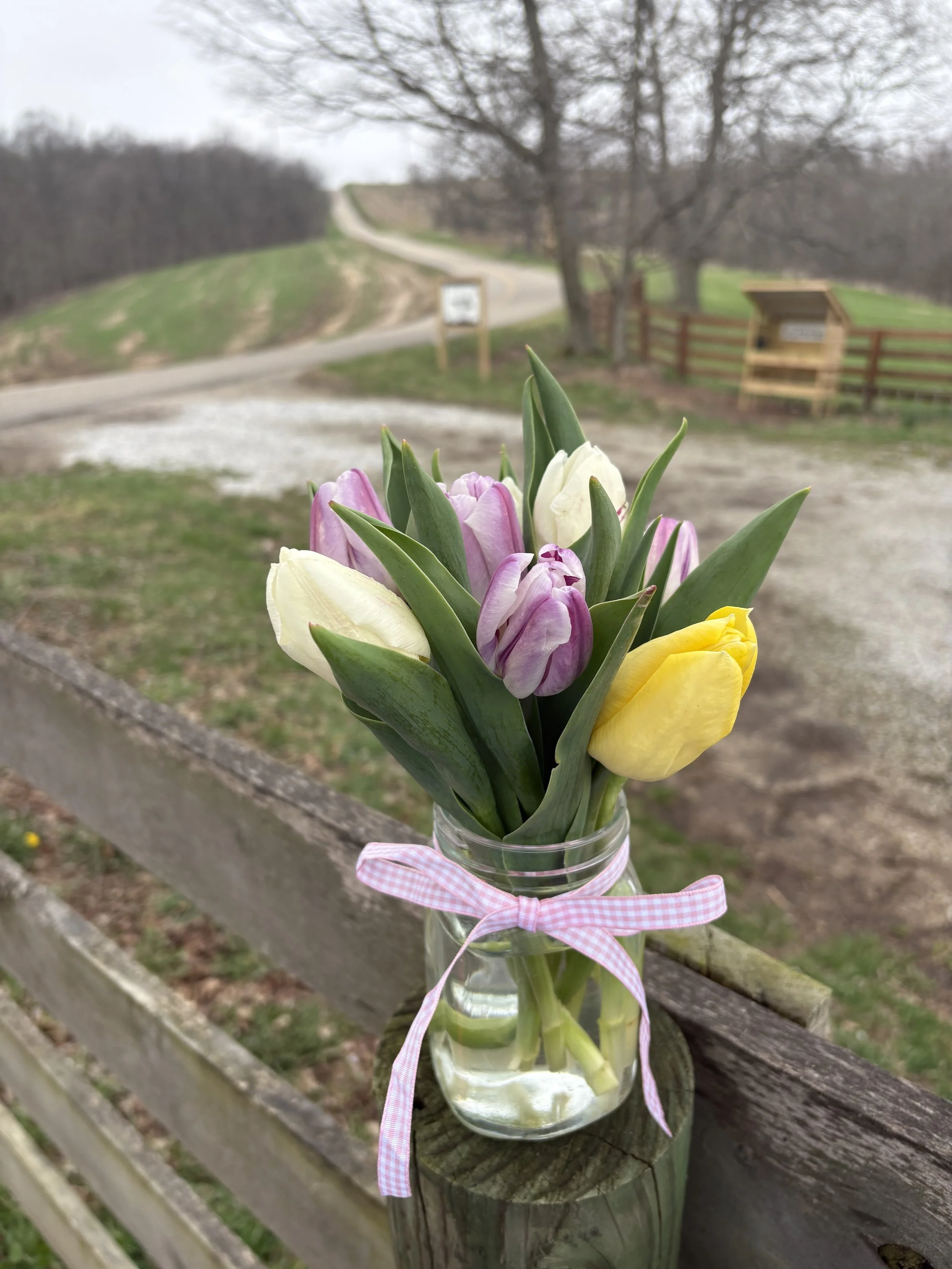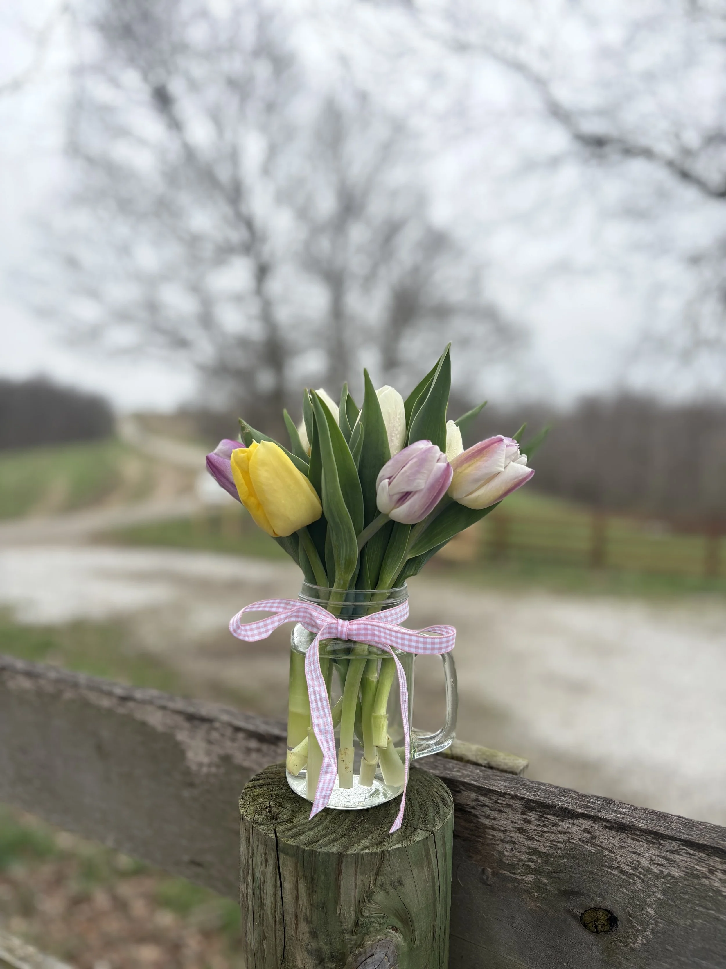These tulips are grown right here, picked fresh from the field, and tucked into a simple jar for you to enjoy. Every bunch is a little different—colorful, a bit wild, and full of life (just how I like them).